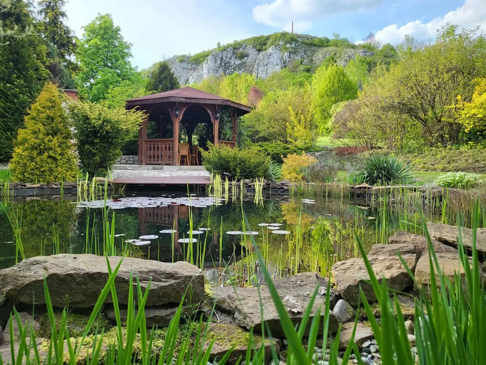 Ponad hektarowy ogród z altanami i uspokajającym widokiem na skały.